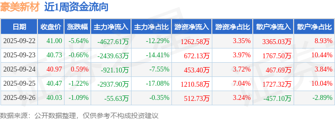 资金流向数据方面,本周豪美新材主力资金合计净流出1.1亿元,游资资金合计净流入4111.44万元,散户资金合计净流入6870.43万元。本周资金流向一览见下表: