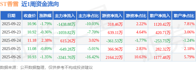 资金流向数据方面,本周ST香雪主力资金合计净流出5874.42万元,游资资金合计净流入3127.23万元,散户资金合计净流入2747.19万元。本周资金流向一览见下表: