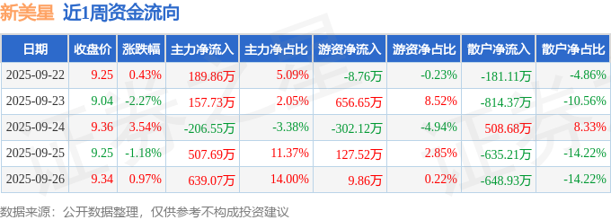 资金流向数据方面,本周新美星主力资金合计净流入1287.8万元,游资资金合计净流入483.15万元,散户资金合计净流出1770.95万元。本周资金流向一览见下表: