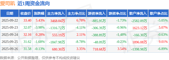 资金流向数据方面,本周爱司凯主力资金合计净流入1538.83万元,游资资金合计净流出910.65万元,散户资金合计净流出628.18万元。本周资金流向一览见下表: