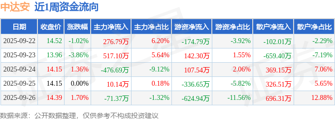 资金流向数据方面,本周中达安主力资金合计净流入255.97万元,游资资金合计净流出886.54万元,散户资金合计净流入630.57万元。本周资金流向一览见下表: