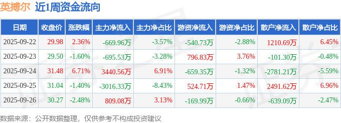 资金流向数据方面,本周英搏尔主力资金合计净流出132.18万元,游资资金合计净流出48.53万元,散户资金合计净流入180.71万元。本周资金流向一览见下表: