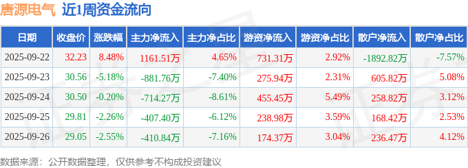 资金流向数据方面,本周唐源电气主力资金合计净流出1252.77万元,游资资金合计净流入1876.05万元,散户资金合计净流出623.28万元。本周资金流向一览见下表:
