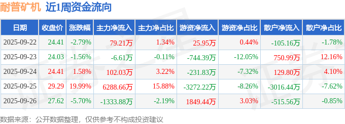 资金流向数据方面,本周耐普矿机主力资金合计净流入5129.42万元,游资资金合计净流出2373.05万元,散户资金合计净流出2756.37万元。本周资金流向一览见下表: