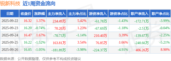 资金流向数据方面,本周锐新科技主力资金合计净流入215.87万元,游资资金合计净流出66.58万元,散户资金合计净流出149.29万元。本周资金流向一览见下表: