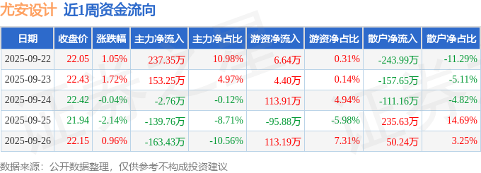 资金流向数据方面,本周尤安设计主力资金合计净流入84.65万元,游资资金合计净流入142.27万元,散户资金合计净流出226.92万元。本周资金流向一览见下表: