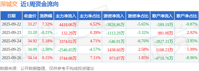 资金流向数据方面,本周深城交主力资金合计净流入9122.41万元,游资资金合计净流出3076.59万元,散户资金合计净流出6045.82万元。本周资金流向一览见下表: