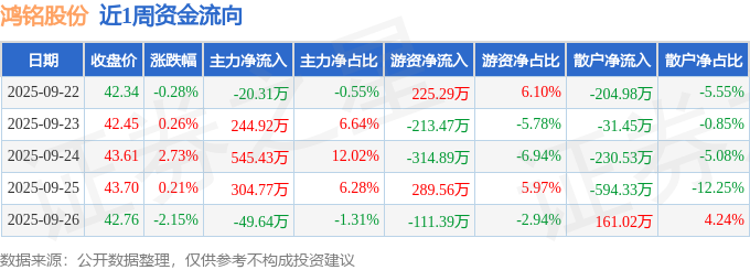 资金流向数据方面,本周鸿铭股份主力资金合计净流入1025.18万元,游资资金合计净流出124.9万元,散户资金合计净流出900.28万元。本周资金流向一览见下表: