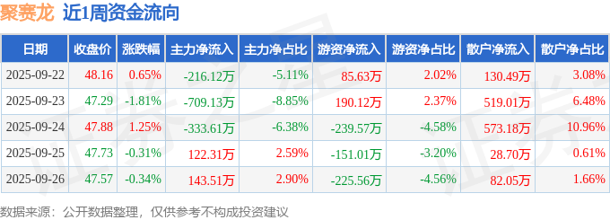资金流向数据方面,本周聚赛龙主力资金合计净流出993.05万元,游资资金合计净流出340.38万元,散户资金合计净流入1333.43万元。本周资金流向一览见下表: