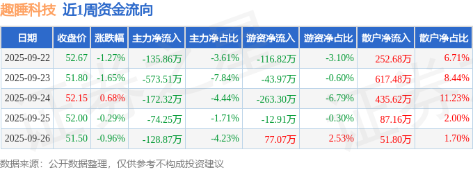 资金流向数据方面,本周趣睡科技主力资金合计净流出1084.81万元,游资资金合计净流出359.94万元,散户资金合计净流入1444.75万元。本周资金流向一览见下表: