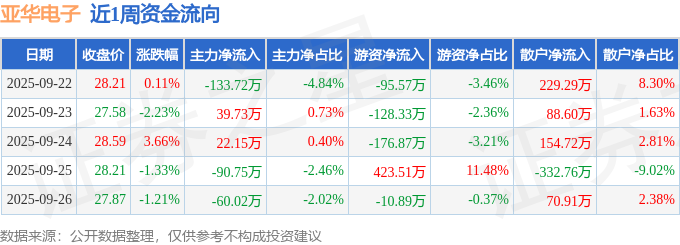资金流向数据方面,本周亚华电子主力资金合计净流出222.61万元,游资资金合计净流入11.84万元,散户资金合计净流入210.76万元。本周资金流向一览见下表: