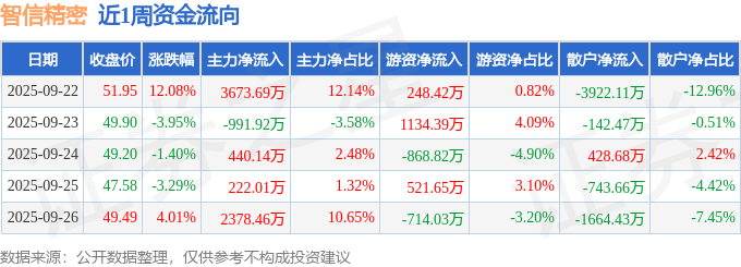 资金流向数据方面,本周智信精密主力资金合计净流入5722.38万元,游资资金合计净流入321.61万元,散户资金合计净流出6043.99万元。本周资金流向一览见下表: