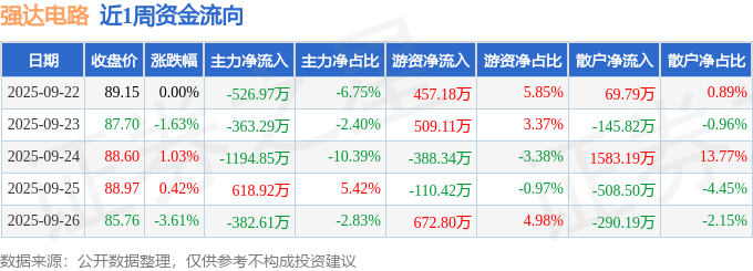 资金流向数据方面,本周强达电路主力资金合计净流出1848.8万元,游资资金合计净流入1140.33万元,散户资金合计净流入708.48万元。本周资金流向一览见下表: