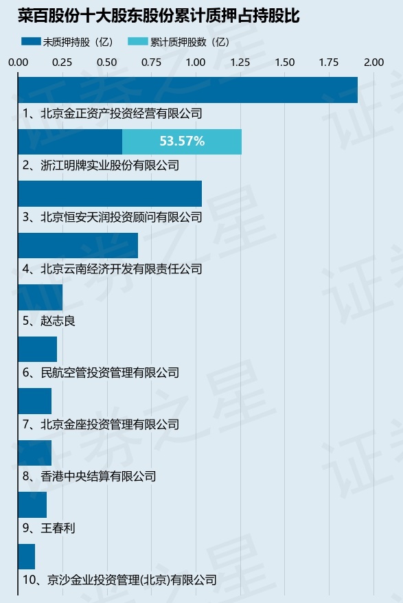 截止本公告日,股东浙江明牌实业股份有限公司已累计质押股份6750.0万股,占其持股总数的53.57%。本次质押后菜百股份十大股东的累计质押股份占持股比例(占持股比例的计算以公司最新一期财务报表公布的十大股东的持股总数为基准)见下图: