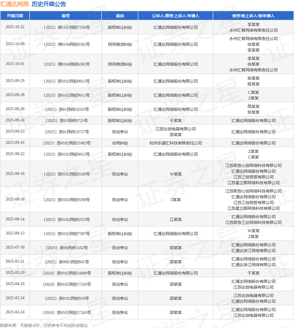 案号:(2025)湘0104民初6382号根据统计,近一年内以汇通达网络股份有限公司为当事人的历史开庭公告有34则,其中案由为“股权转让纠纷”的公告以13则居首,其次为“劳动争议”有11则,“买卖合同纠纷”有4则。历史开庭公告(前20条)如下: