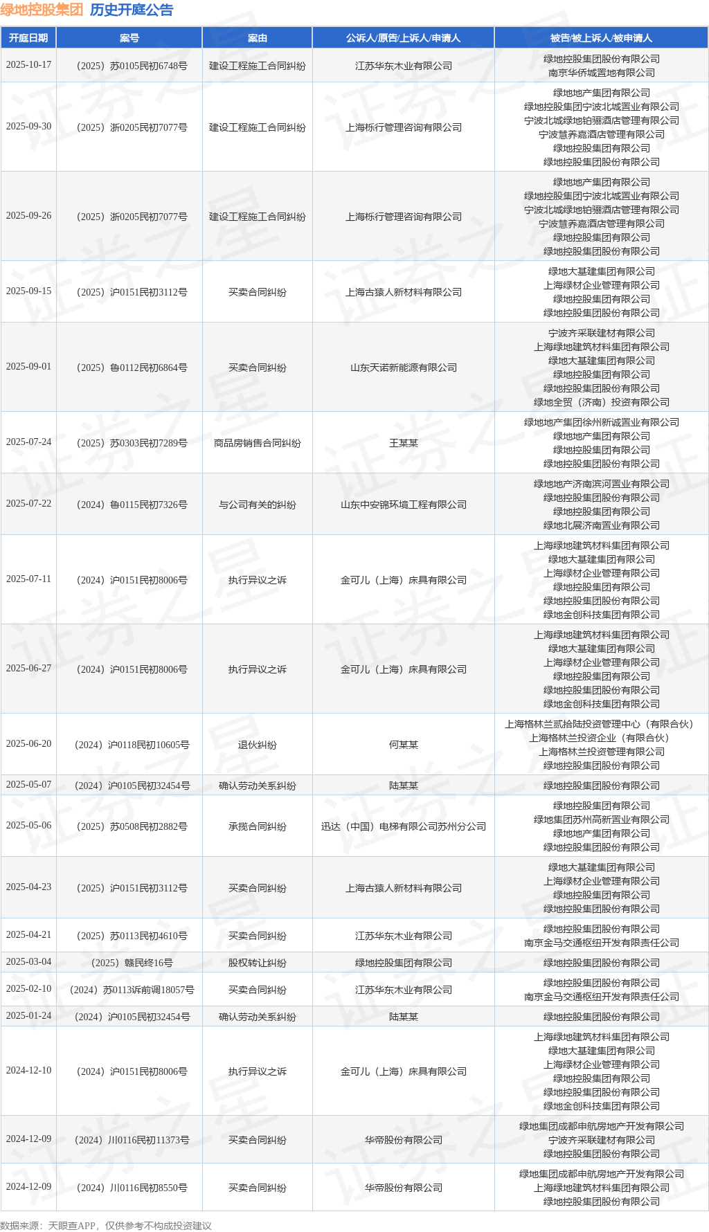 案号:(2025)浙0205民初7077号根据统计,近一年内以绿地控股集团股份有限公司为当事人的历史开庭公告有22则,其中案由为“买卖合同纠纷”的公告以8则居首,其次为“建设工程施工合同纠纷”有3则,“执行异议之诉”有3则。历史开庭公告(前20条)如下:
