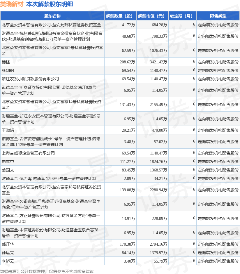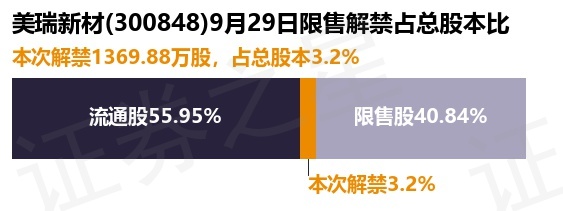 证券之星消息,根据市场公开信息整理,美瑞新材(300848)于9月29日将有1369.88万股限售股份解禁,为公司定向增发机构配售股份,占公司总股本3.2%。(本次数据根据历史公告整理得出,实际情况以上市公司最新公告为准)本次解禁后,公司还有1.75亿股限售股份,占总股本40.84%。具体如下图所示: