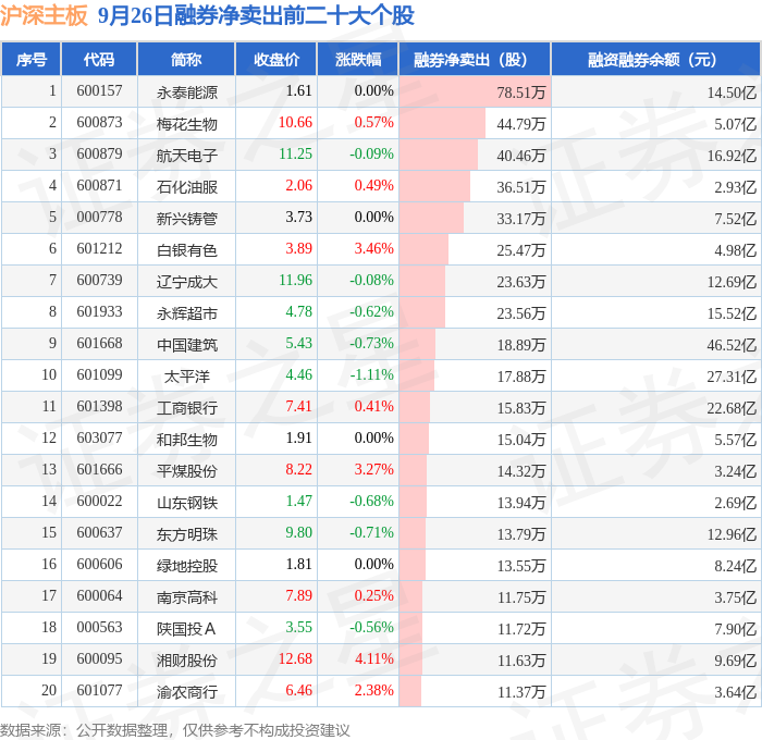 沪深主板融券净卖出前三分别为:永泰能源(600157)融券净卖出78.51万股、梅花生物(600873)融券净卖出44.79万股、航天电子(600879)融券净卖出40.46万股,前20具体见下表: