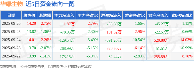 证券之星消息,截至2025年9月26日收盘,华绿生物(300970)报收于14.2元,上涨2.75%,换手率3.02%,成交量2.84万手,成交额4011.62万元。