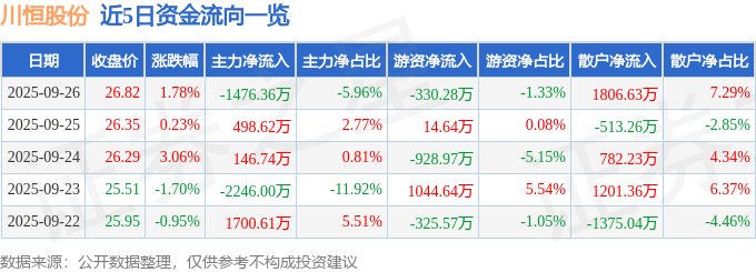 证券之星消息,截至2025年9月26日收盘,川恒股份(002895)报收于26.82元,上涨1.78%,换手率1.55%,成交量9.27万手,成交额2.48亿元。