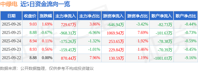 证券之星消息,截至2025年9月26日收盘,中绿电(000537)报收于9.03元,上涨1.69%,换手率1.02%,成交量20.99万手,成交额1.89亿元。