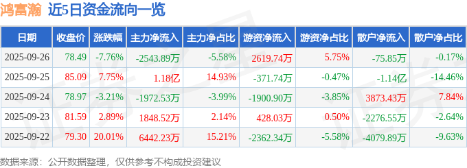 证券之星消息,截至2025年9月26日收盘,鸿富瀚(301086)报收于78.49元,下跌7.76%,换手率11.97%,成交量5.66万手,成交额4.56亿元。