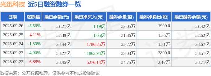 光迅科技融资融券信息显示,融资方面,当日融资买入4.19亿元,融资偿还5.37亿元,融资净偿还1.19亿元。融券方面,融券卖出9500.0股,融券偿还7600.0股,融券余量32.05万股,融券余额2168.82万元。融资融券余额31.42亿元。