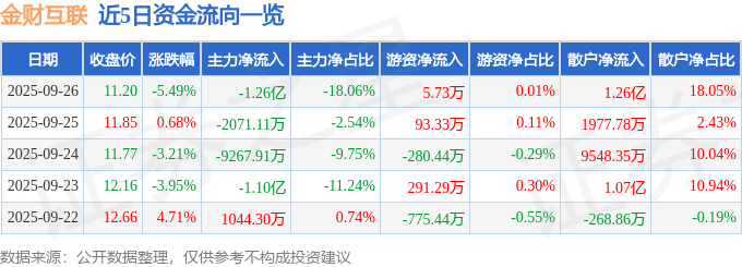 证券之星消息,截至2025年9月26日收盘,金财互联(002530)报收于11.2元,下跌5.49%,换手率8.79%,成交量61.13万手,成交额7.0亿元。