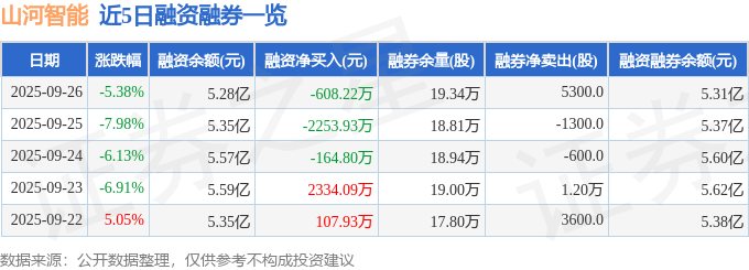 山河智能融资融券信息显示,融资方面,当日融资买入1.24亿元,融资偿还1.3亿元,融资净偿还608.22万元。融券方面,融券卖出8300.0股,融券偿还3000.0股,融券余量19.34万股,融券余额244.84万元。融资融券余额5.31亿元。