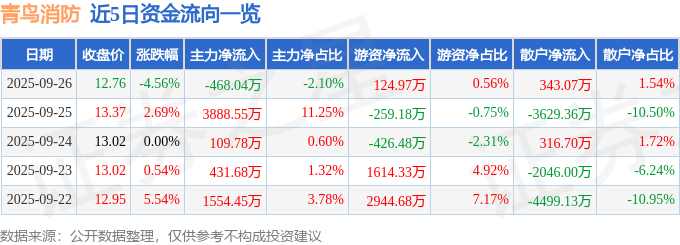 证券之星消息,截至2025年9月26日收盘,青鸟消防(002960)报收于12.76元,下跌4.56%,换手率2.31%,成交量17.29万手,成交额2.23亿元。