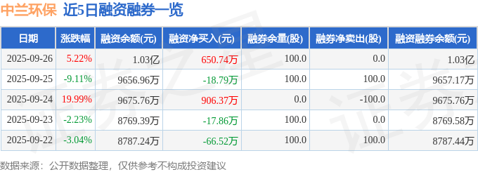 中兰环保融资融券信息显示,融资方面,当日融资买入4447.73万元,融资偿还3796.99万元,融资净买入650.74万元。融券方面,融券卖出0.0股,融券偿还0.0股,融券余量100.0股,融券余额0.22万元。融资融券余额1.03亿元。