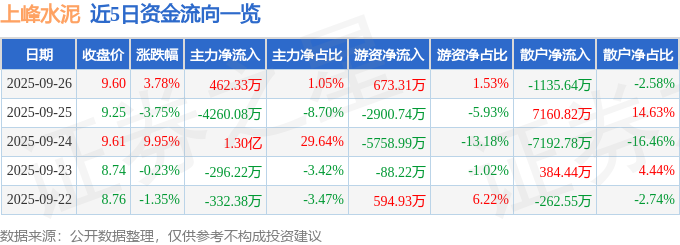 证券之星消息,截至2025年9月26日收盘,上峰水泥(000672)报收于9.6元,上涨3.78%,换手率4.7%,成交量45.6万手,成交额4.4亿元。