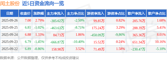 证券之星消息,截至2025年9月26日收盘,闰土股份(002440)报收于7.0元,上涨2.79%,换手率1.85%,成交量17.54万手,成交额1.22亿元。