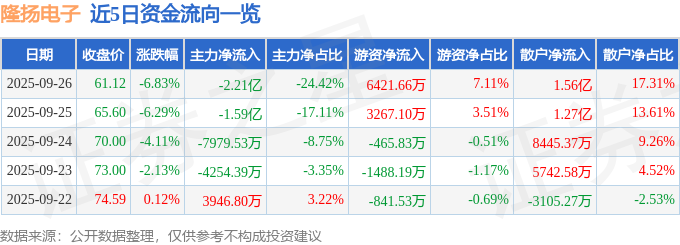 证券之星消息,截至2025年9月26日收盘,隆扬电子(301389)报收于61.12元,下跌6.83%,换手率17.74%,成交量14.56万手,成交额9.03亿元。