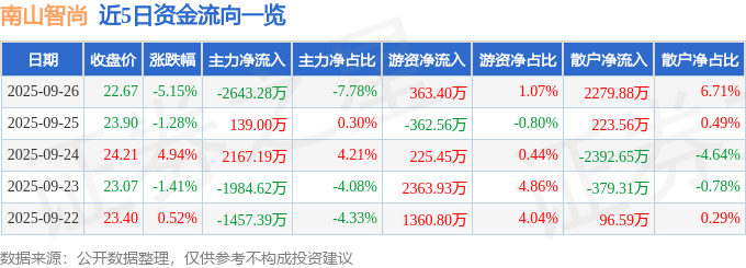 证券之星消息,截至2025年9月26日收盘,南山智尚(300918)报收于22.67元,下跌5.15%,换手率3.37%,成交量14.65万手,成交额3.4亿元。