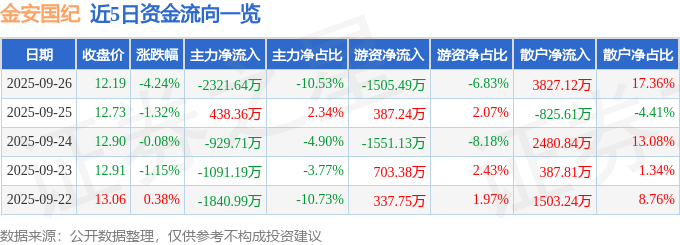 9月26日的资金流向数据方面,主力资金净流出2321.64万元,占总成交额10.53%,游资资金净流出1505.49万元,占总成交额6.83%,散户资金净流入3827.12万元,占总成交额17.36%。