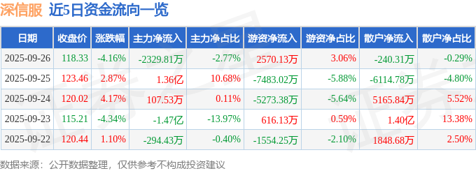 证券之星消息,截至2025年9月26日收盘,深信服(300454)报收于118.33元,下跌4.16%,换手率2.52%,成交量7.0万手,成交额8.41亿元。