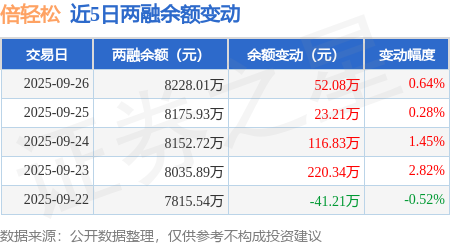 证券之星消息,9月26日,倍轻松(688793)融资买入298.34万元,融资偿还246.25万元,融资净买入52.08万元,融资余额8228.01万元,近3个交易日已连续净买入累计192.13万元,近20个交易日中有12个交易日出现融资净买入。