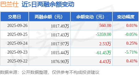 证券之星消息,9月26日,巴兰仕(920112)融资买入40.36万元,融资偿还40.3万元,融资净买入0.06万元,融资余额1017.49万元。
