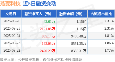 证券之星消息,9月26日,燕麦科技(688312)融资买入2549.68万元,融资偿还2592.29万元,融资净卖出42.61万元,融资余额1.15亿元。