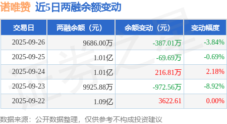 证券之星消息,9月26日,诺唯赞(688105)融资买入299.26万元,融资偿还686.02万元,融资净卖出386.76万元,融资余额9614.19万元,近20个交易日中有13个交易日出现融资净买入。