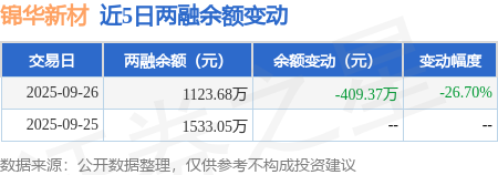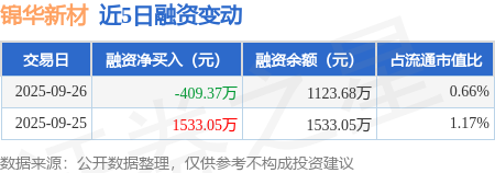 证券之星消息,9月26日,锦华新材(920015)融资买入1054.66万元,融资偿还1464.03万元,融资净卖出409.37万元,融资余额1123.68万元。