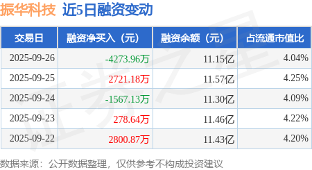 证券之星消息,9月26日,振华科技(000733)融资买入9535.83万元,融资偿还1.38亿元,融资净卖出4273.96万元,融资余额11.15亿元,近20个交易日中有11个交易日出现融资净买入。