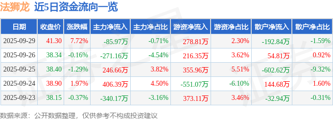 证券之星消息,截至2025年9月29日收盘,法狮龙(605318)报收于41.3元,上涨7.72%,换手率2.41%,成交量3.03万手,成交额1.21亿元。