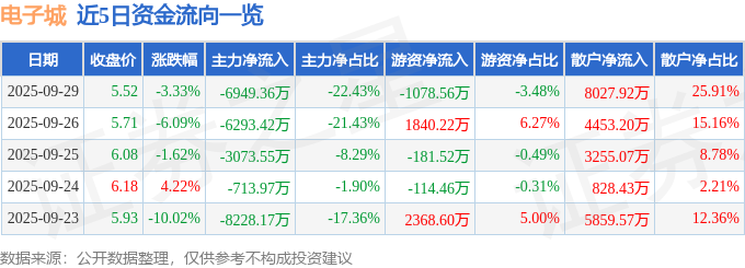 9月29日的资金流向数据方面,主力资金净流出6949.36万元,占总成交额22.43%,游资资金净流出1078.56万元,占总成交额3.48%,散户资金净流入8027.92万元,占总成交额25.91%。
