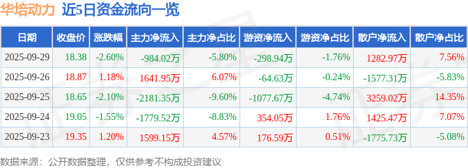 证券之星消息,截至2025年9月29日收盘,华培动力(603121)报收于18.38元,下跌2.6%,换手率2.72%,成交量9.21万手,成交额1.7亿元。