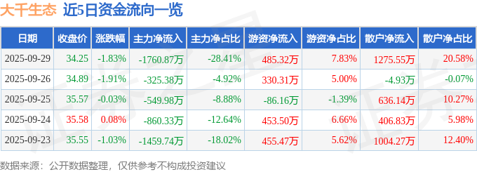 证券之星消息,截至2025年9月29日收盘,大千生态(603955)报收于34.25元,下跌1.83%,换手率1.33%,成交量1.8万手,成交额6197.83万元。
