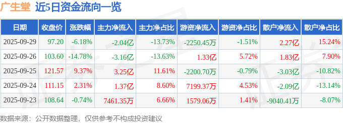 证券之星消息,截至2025年9月29日收盘,广生堂(300436)报收于97.2元,下跌6.18%,换手率11.07%,成交量15.13万手,成交额14.89亿元。