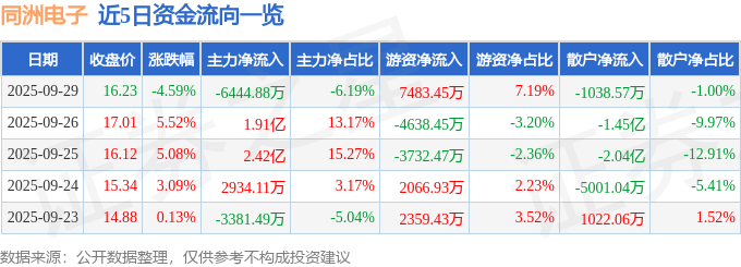 证券之星消息,截至2025年9月29日收盘,同洲电子(002052)报收于16.23元,下跌4.59%,换手率9.23%,成交量63.65万手,成交额10.42亿元。