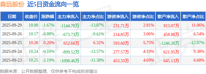 证券之星消息,截至2025年9月29日收盘,森远股份(300210)报收于10.0元,下跌1.67%,换手率1.7%,成交量8.23万手,成交额8254.44万元。